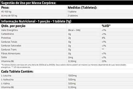 L-leucina, L-valina, L-isoleucina, Vitamina B6 (Piridoxina). NÃO CONTÉM GLÚTEN.
