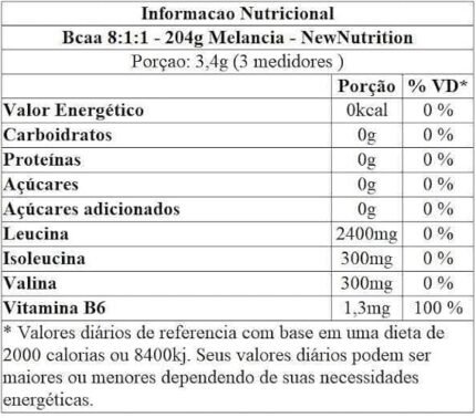 | Porção recomendada | Sugestão de uso: Adicione 1 dosador (5g) de BCAA 3:1:1 em 120 ml de água, consuma cerca de 30 minutos antes do treino e tome outra dose logo após a atividade física |